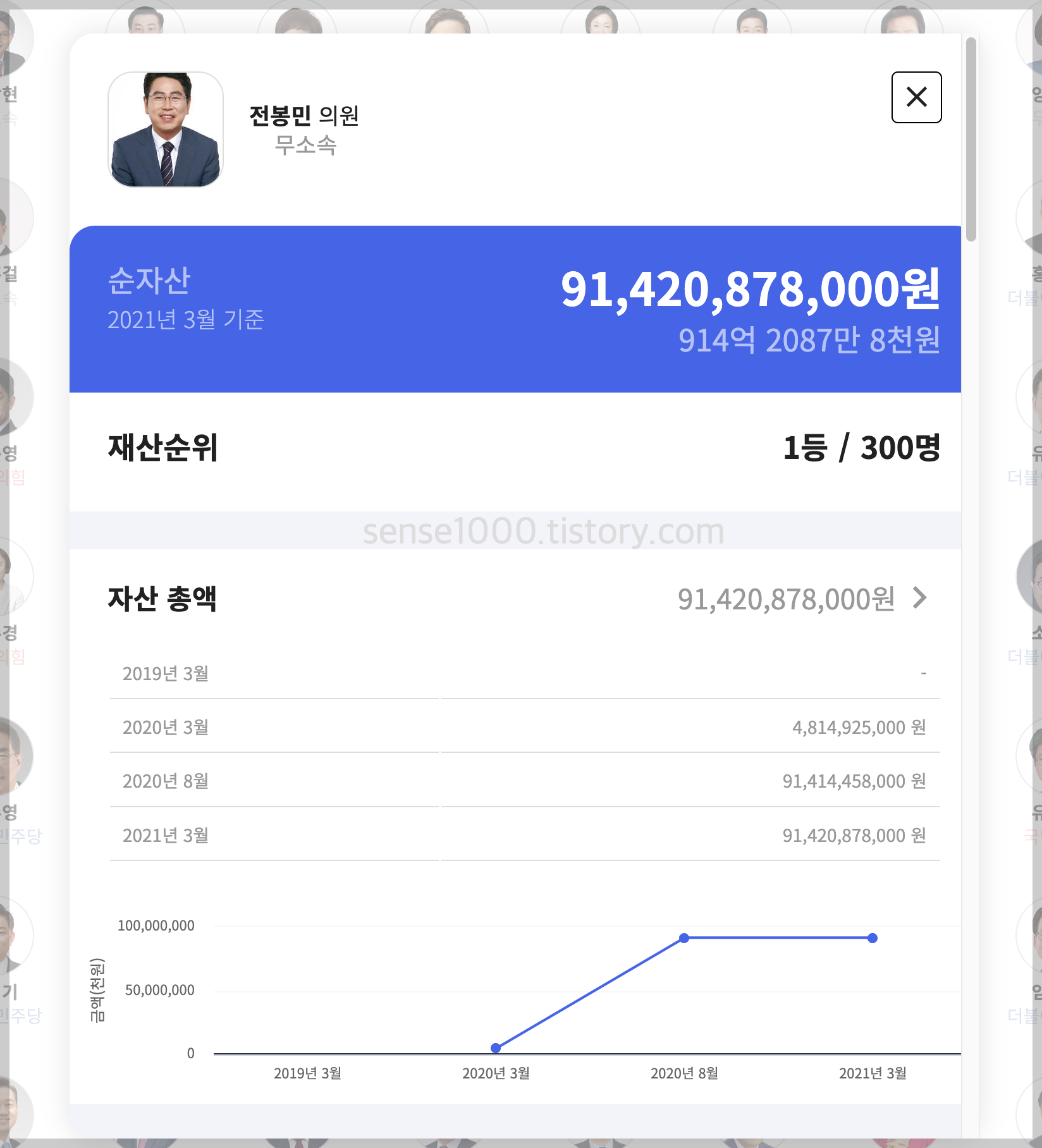 예시로 재산순위 1위의 전봉민 의원을 검색해봤습니다. 순자산 뿐만 아니라 재산순위, 연도별 자산 변화를 볼 수 있습니다.